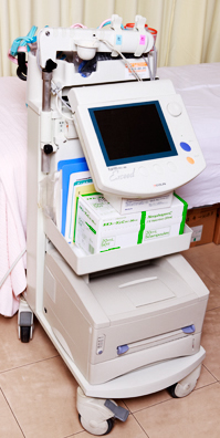 スパイロメーターという測定装置を使って肺活量や換気量を調べます。肺年齢がわかるとも言われます。ホース状の酸素吸入口に口をあて、息を大きく吸って吐き出します。呼吸器系の病気の有無をみる検査です。